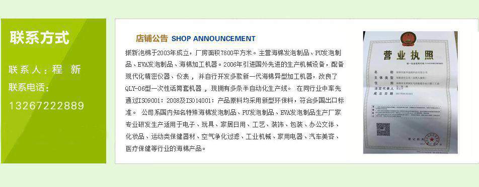 深圳市振新泡棉科技有限公司于2003年成立,廠房面積7800平方米。主營(yíng)海棉發(fā)泡制品、PU發(fā)泡制品、EVA發(fā)泡制品、海棉加工機(jī)器。2006年引進(jìn)國(guó)外先進(jìn)的生產(chǎn)機(jī)械設(shè)備,配備現(xiàn)代化精密儀器、儀表 , 并自行開發(fā)多款新一代海棉異型加工機(jī)器,改良了QLY-06型一次性話筒套機(jī)器 , 現(xiàn)擁有多條半自動(dòng)化生產(chǎn)線。 我們擁有一批經(jīng)驗(yàn)豐富的工程技術(shù)人員和高級(jí)管理人員,在同行業(yè)中率先通過(guò)ISO9001:2008及ISO14001:產(chǎn)品原料均采用新型環(huán)保料,符合多國(guó)出口標(biāo)準(zhǔn)。 公司系國(guó)內(nèi)知名特殊海棉發(fā)泡制品、PU發(fā)泡制品、EVA發(fā)泡制品生產(chǎn)廠家,專業(yè)研發(fā)生產(chǎn)適用于電子、玩具、家居日用、工藝、裝飾、包裝、辦公文體、化妝品、運(yùn)動(dòng)類保健器材、空氣凈化過(guò)濾、工業(yè)機(jī)械、家用電器、汽車美容、醫(yī)療保健等行業(yè)的海棉產(chǎn)品。 產(chǎn)品的類型如:高密度聚酯海棉、普通海棉、異型定型海棉、防火/阻燃海棉、高回彈/慢回彈海棉、過(guò)濾網(wǎng)狀海棉、EVA玩具禮品、PU發(fā)泡定型玩具禮品等等。產(chǎn)品名稱如:耳機(jī)/話筒KTV海棉套、海棉圓球、洗刷海棉、吸水海棉、木漿海棉、化妝海棉、相機(jī)海棉、墨盒海棉、壓縮海棉、橡膠海棉、粗細(xì)孔過(guò)濾海棉、波峰隔音海棉、醫(yī)用海棉、海棉枕頭、包裝防震海棉、1mm厚海棉、電子/醫(yī)用海棉棉簽、EVA球、EVA智力拼圖、EVA鑰匙扣、PU座墊、PU公仔、PU球類等等。 我們還獲得多家國(guó)際知名廠商的授權(quán)資格,代理多品種家庭用品。 產(chǎn)品多年來(lái)一直銷往全球,深受廣大用戶和客商的青睞。